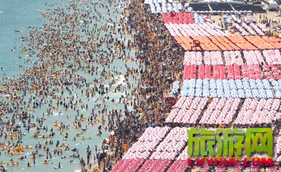 當(dāng)?shù)貢r(shí)間2009年8月2日,韓國釜山海云臺海水浴場,民眾紛紛涌向這里來度假,十分擁擠。